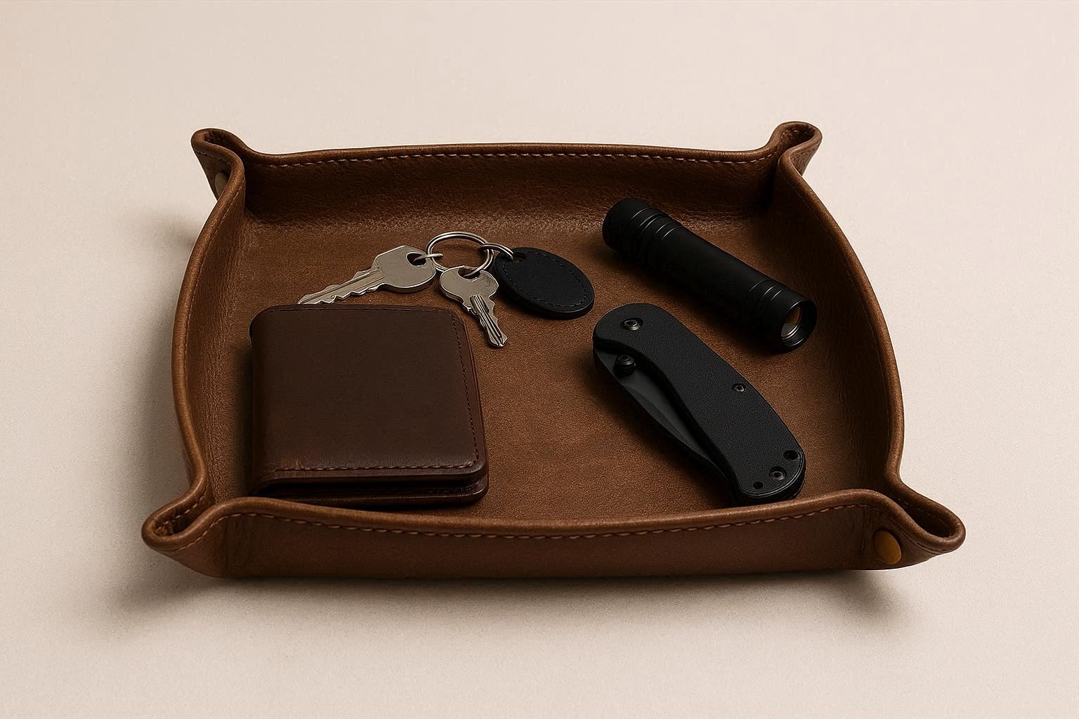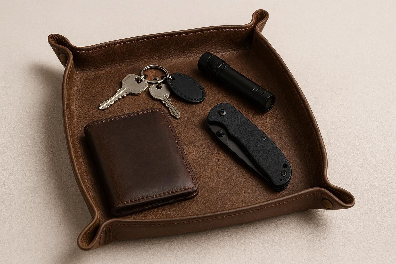 This stylish valet tray features a premium PU leather exterior with a soft microfiber lining, offering a luxurious way to organize your everyday carry items. Measuring 12.6 x 8.7 x 2.4 inches, it provides ample space for your wallet, keys, smartphone, watch, and sunglasses. The structured design holds its shape beautifully.