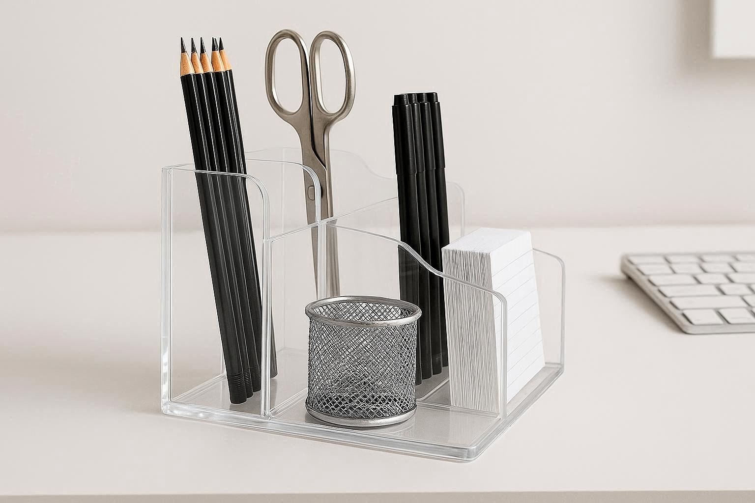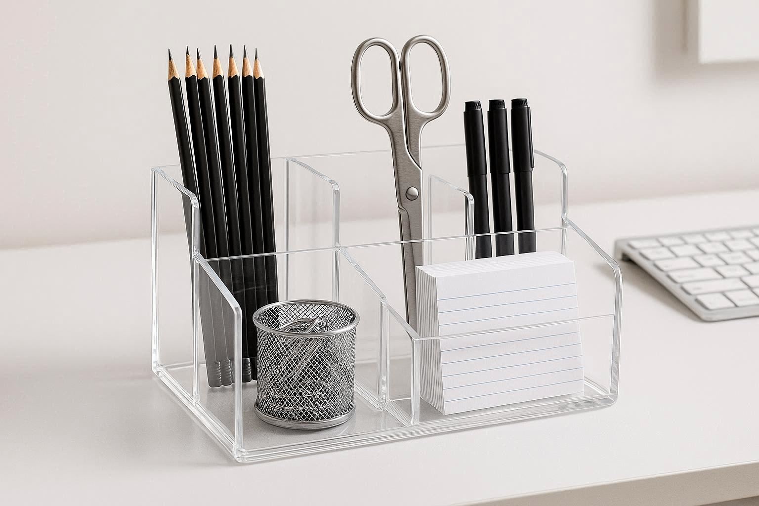 The high-quality acrylic is durable, scratch-resistant, and easy to clean with a soft, damp cloth. Its minimalist aesthetic fits seamlessly into any office, home study, or studio decor. The organizer is designed to be stable on your desk, preventing items from toppling over.