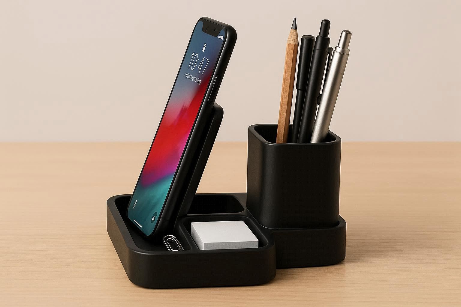 The design consolidates multiple desk essentials into one cohesive unit, saving valuable workspace. The pen cup can hold numerous writing instruments, and the notepad holder keeps your paper in place. Additional small trays are perfect for paper clips, sticky notes, or business cards.