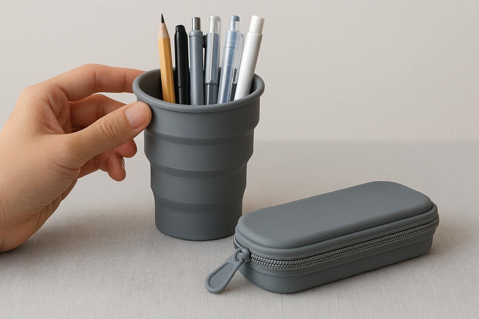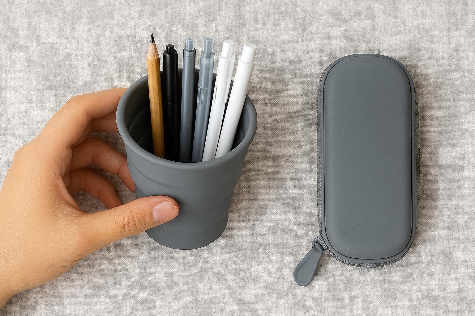 Crafted from flexible, durable food-grade silicone, this innovative pen holder is fully collapsible, making it perfect for travel, students, or minimalist desks. When expanded, it stands firm to hold pens upright; when empty, it flattens to less than an inch thick for easy storage in a bag or drawer.
