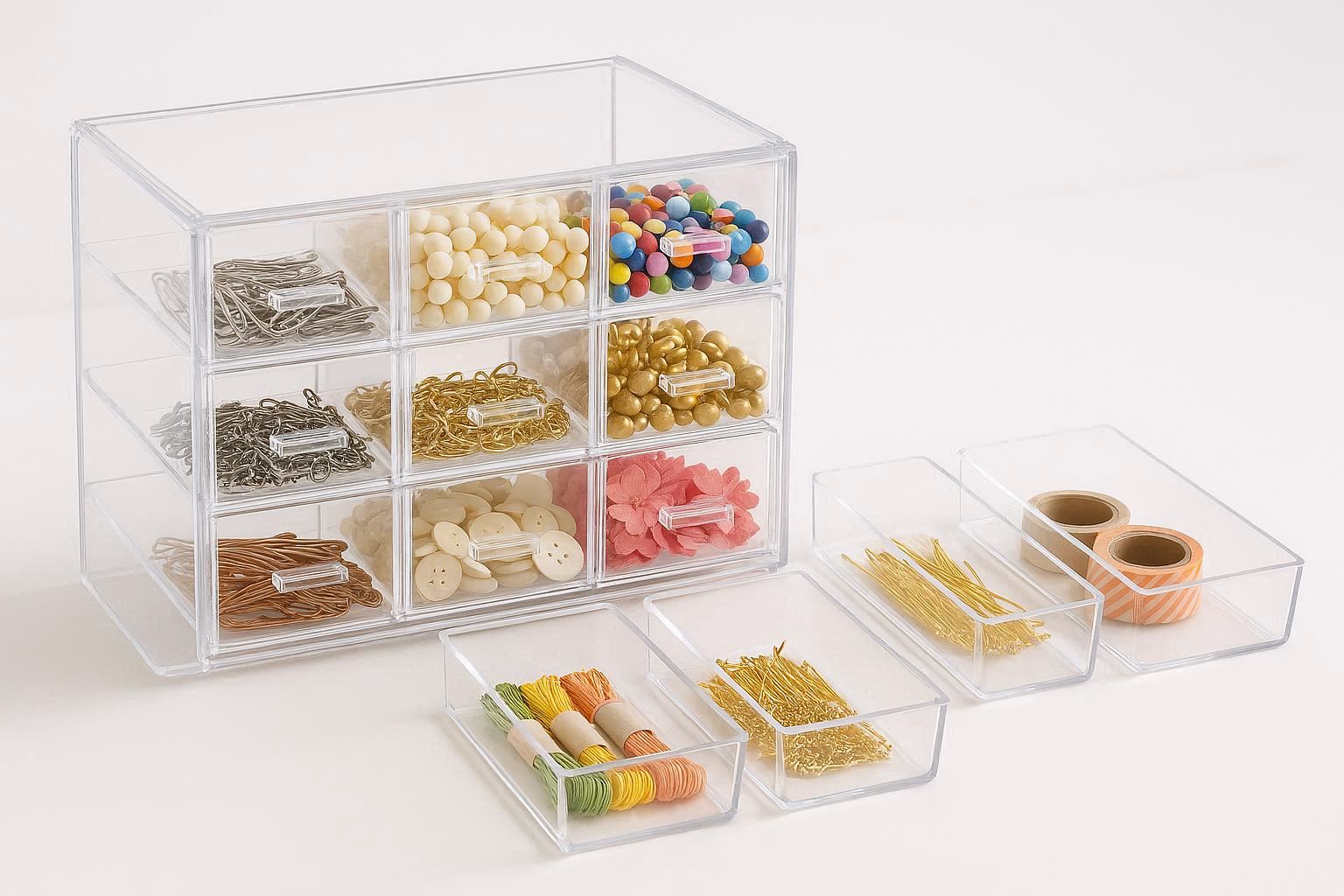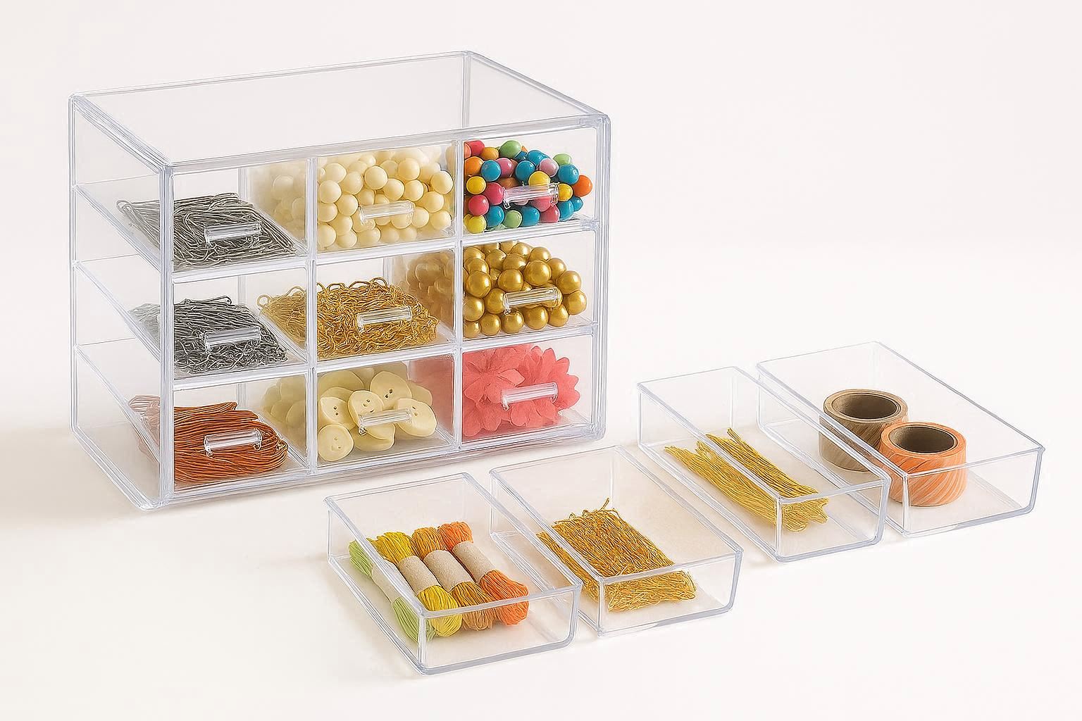 This set includes multiple small, clear plastic drawers within a sturdy frame, perfect for sorting tiny items. The main unit dimensions are approximately 10.2 x 7.1 x 6.3 inches, containing 12 to 24 small drawers of varying sizes, depending on the configuration. Each drawer slides smoothly on rails.