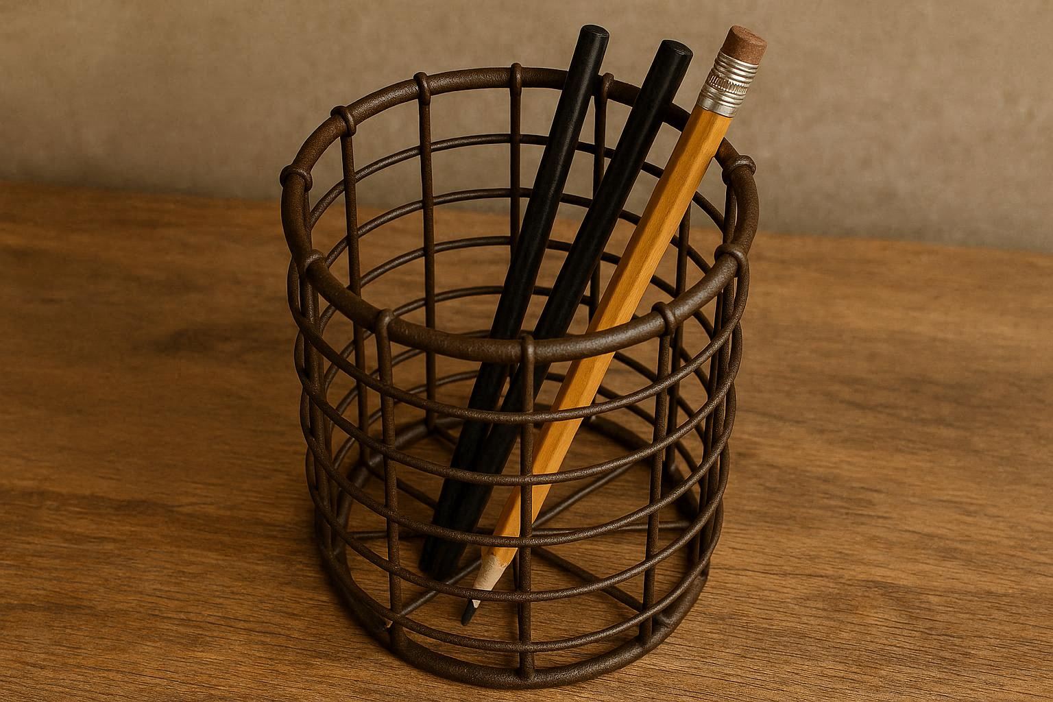 Inspired by vintage factory style, this pen cup is constructed from sturdy iron wire formed into a classic mesh basket design. The wrought-iron look, complete with a subtle antique bronze finish, adds character and a rustic, industrial vibe to any space. It is both sturdy and surprisingly lightweight.
