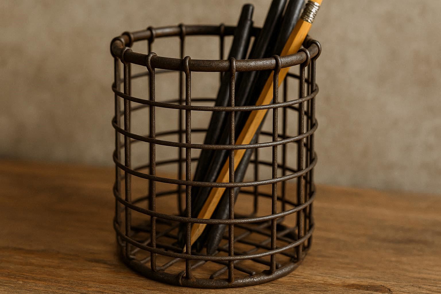 Vintage Industrial Iron Wire Pen Cup for Rustic Office and Home Decor