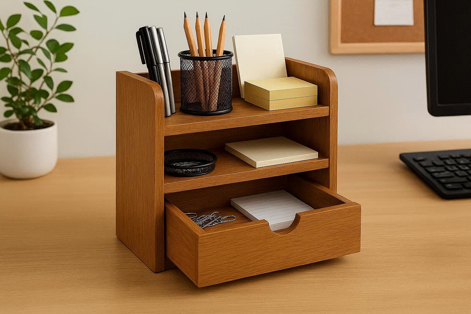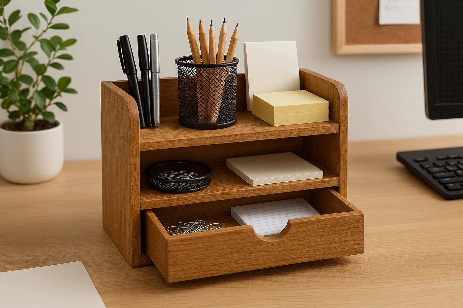 The main compartment is ideal for notebooks, folders, or larger items, while the drawer is perfect for storing smaller essentials like sticky notes, erasers, and USB drives. The wood is treated with a natural, non-toxic sealant to protect against moisture and daily wear.